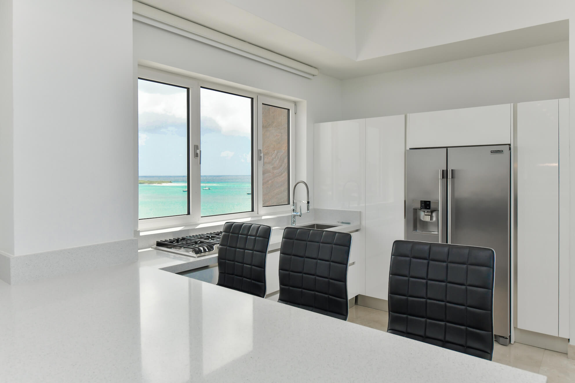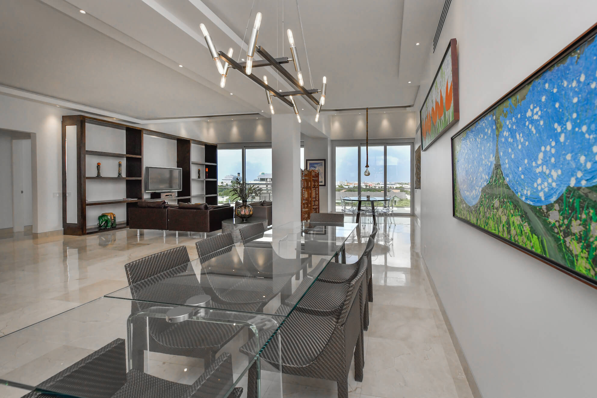 The open floor plan creates a flow between the living, dining, and entertainment areas. Floor-to-ceiling windows flood the interiors with natural light while showcasing panoramic views of the Caribbean Sea.